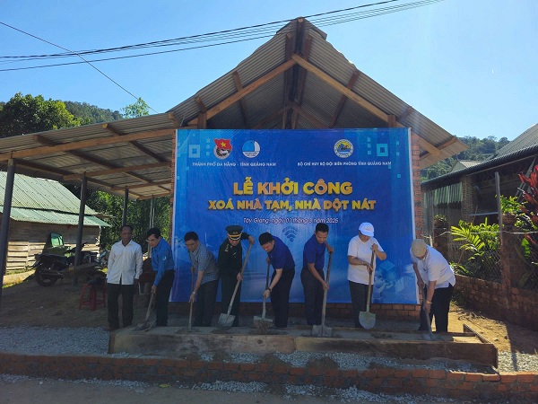 Đồng chí Ủy viên BCH Trung ương Đoàn, Phó Bí thư Tỉnh đoàn Quảng Nam Vũ Gia Dân và Phó Chính ủy Bộ Chỉ huy Bộ đội Biên phòng tỉnh Quảng Nam Đại tá Nguyễn Bá Hưng trao tặng kinh phí, vật liệu xây dựng cho các hộ gia đình nằm trong danh xoá nhà tạm, nhà dột nát.