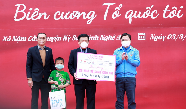 Đồng chí Nguyễn Anh Tuấn, Bí thư thứ nhất TƯ Đoàn và đại diện Tập đoàn TH True Milk trao biển tượng trưng xây dựng 20 nhà vệ sinh cho em