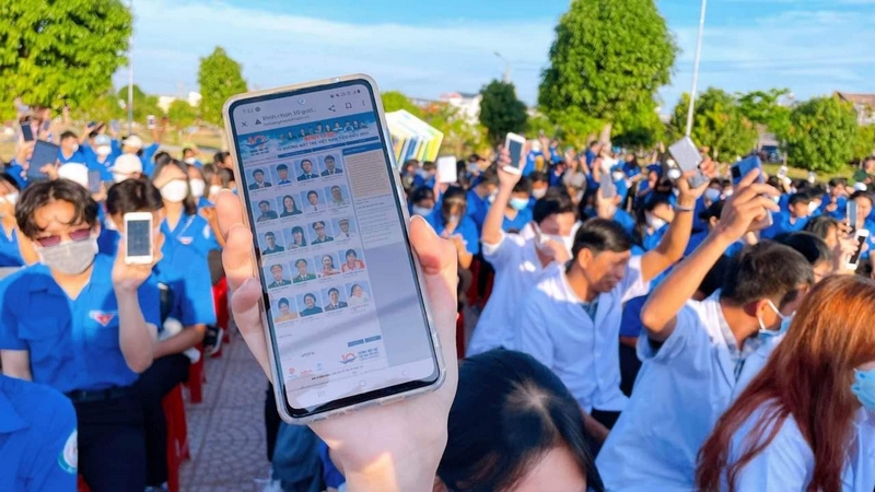 Các bạn đoàn viên thanh niên tổ chức tuyên truyền chuyển đổi số cho người dân, trực tiếp hướng dẫn thực hiện giao dịch không dùng tiền mặt và phổ biến về dịch vụ công trực tuyến cho dân cư trên địa bàn thị xã Chơn Thành.