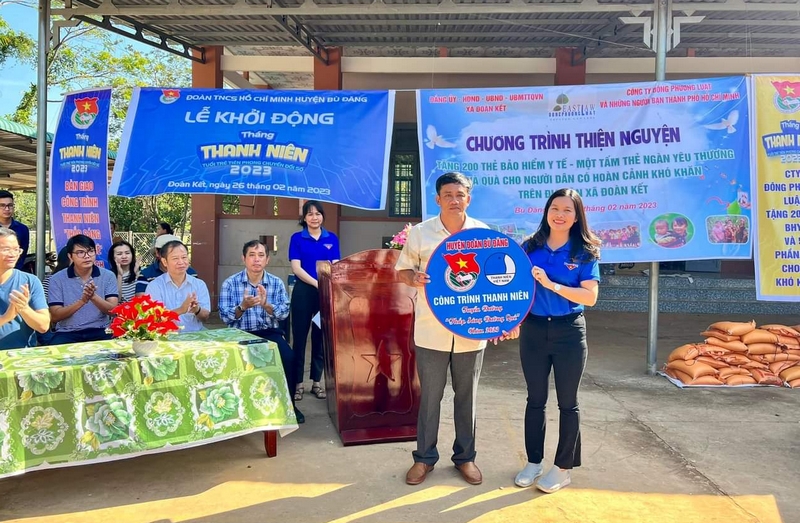 Tại huyện Bù Đăng, huyện Đoàn Bù Đăng phối hợp với UBND xã Đoàn Kết trao tặng 50 phần quà, 200 thẻ bảo hiểm y tế do công ty Luật Đồng Phương tài trợ cho bà con nhân dân khó khăn trên địa bàn xã trị giá 100 triệu đồng; bàn giao công trình thanh niên “Tuyến đường thắp sáng đường quê” năm 2023 trị giá 20 triệu đồng.