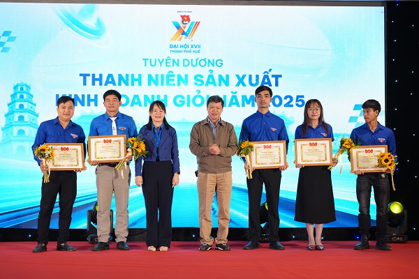 Dịp này, nhằm ghi nhận, biểu dương và lan tỏa những tấm gương thanh niên tiêu biểu trong lĩnh vực sản xuất, kinh doanh, trong khuôn khổ Ngày hội, Ban Thường vụ Thành Đoàn đã trao tặng Bằng khen cho 05 thanh niên tiêu biểu có thành tích xuất sắc trong phong trào thanh niên sản xuất kinh doanh giỏi thành phố Huế năm 2025.