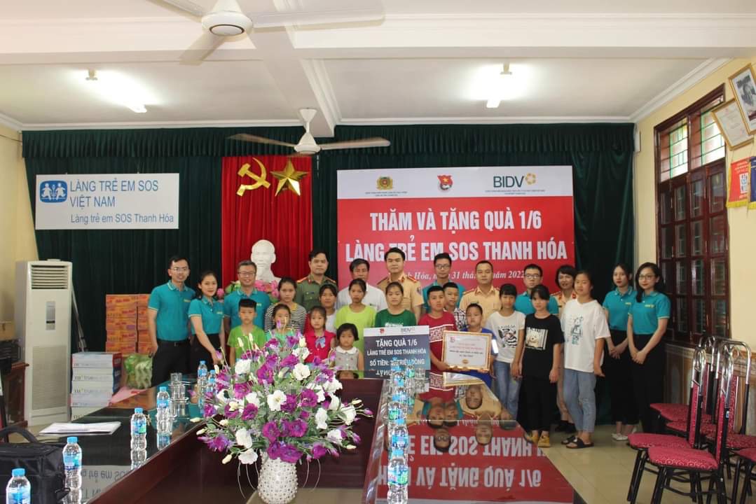 Đoàn Thanh niên Phòng CSGT Công an tỉnh Thanh Hoá phối hợp với Đoàn Thanh niên Ngân hàng cổ phần đầu tư và phát triển Việt Nam (BIDV) - Chi nhánh Thanh Hoá đến thăm và trao quà động viên các trẻ em mồ côi, trẻ em có hoàn cảnh khó khăn làng trẻ em SOS nhân ngày Quốc tế thiếu nhi với tổng trị giá gần 20 triệu đồng