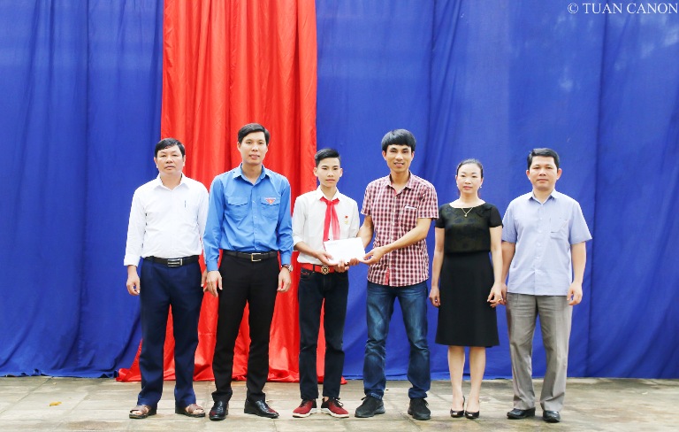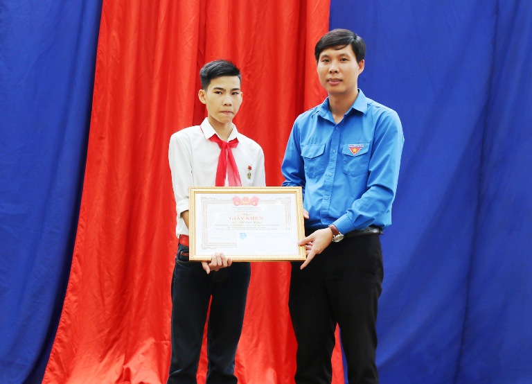 Anh Nguyễn Hữu Tuất - Phó Bí thư Tỉnh đoàn, Chủ tịch Hội đồng Đội tỉnh Thanh Hóa tặng giấy khen cùng phần thưởng của Hội đồng đội tỉnh cho em Vũ Văn Hùng
