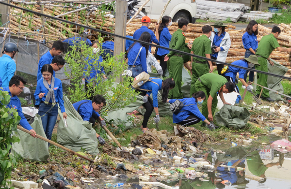 Đoàn viên, thanh niên tiến hành thu gom rác thải, dọn vệ sinh môi trường