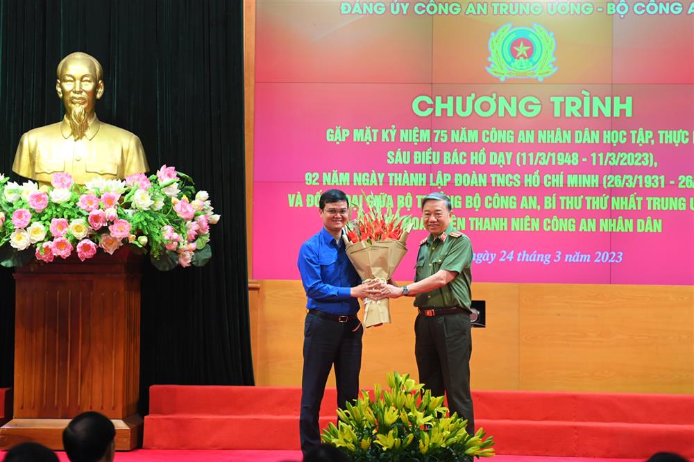 Bộ trưởng Bộ Công an Tô Lâm tặng hoa chúc mừng Bí thư thứ nhất Trung ương Đoàn Bùi Quang Huy nhân Kỷ niệm 92 năm Ngày thành lập Đoàn Thanh niên Cộng sản Hồ Chí Minh (26/3/1931-26/3/2023)