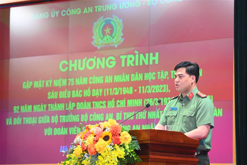 Trung tá Đồng Đức Vũ, Trưởng Ban Thanh niên CAND trình bày diễn văn kỷ niệm 92 năm Ngày thành lập Đoàn TNCS Hồ Chí Minh
