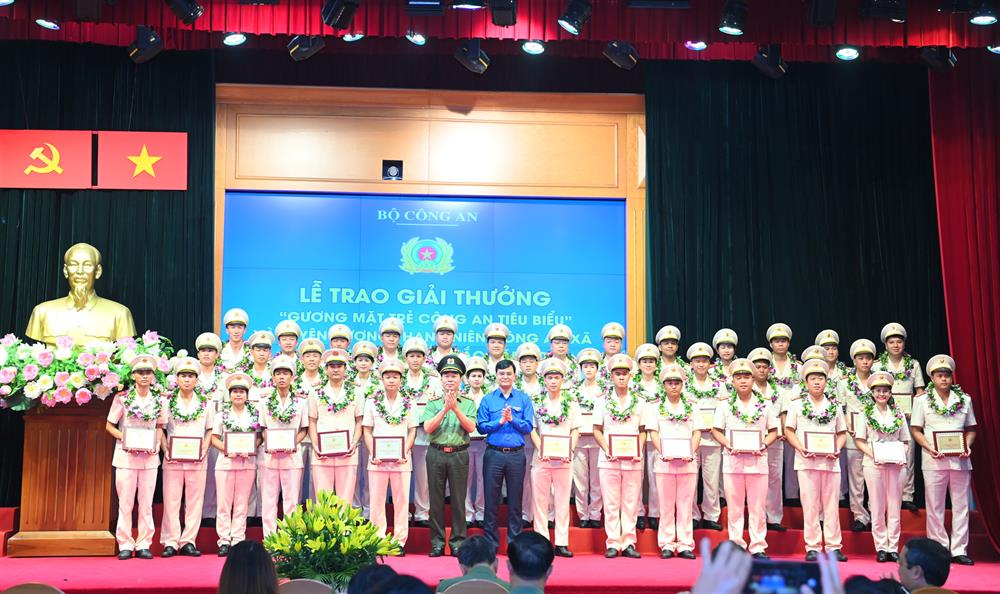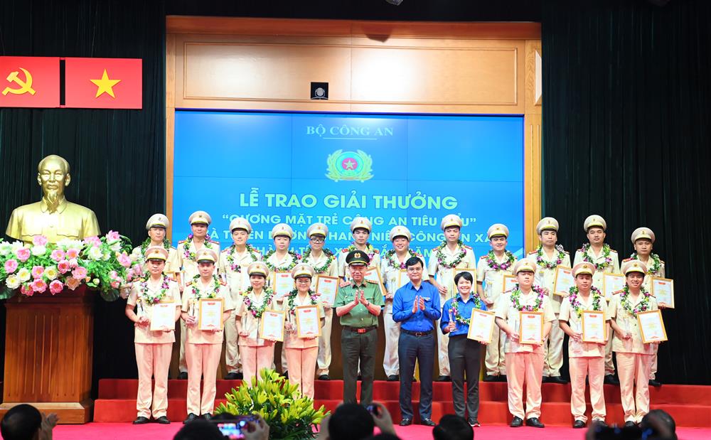 Bộ trưởng Bộ Công an Tô Lâm và Bí thư thứ nhất Trung ương Đoàn Bùi Quang Huy trao chứng nhận và biểu trưng "Gương mặt trẻ Công an tiêu biểu"