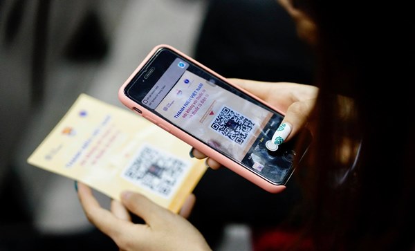 Các bạn sinh viên quét QR Code để ký cam kết "nói không với thuốc lá và thuốc lá điện tử". Ảnh: TTXVN