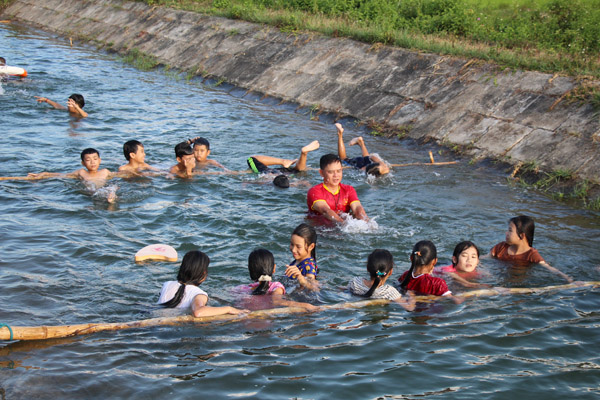 Thầy Tước dạy bơi cho trẻ em ở đoạn kênh thủy lợi thôn Lam Thủy