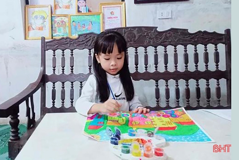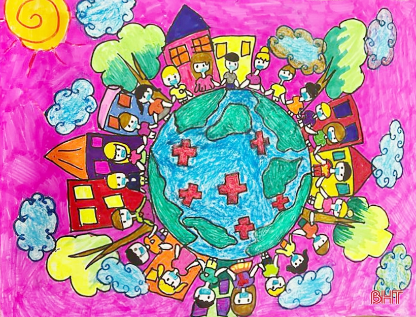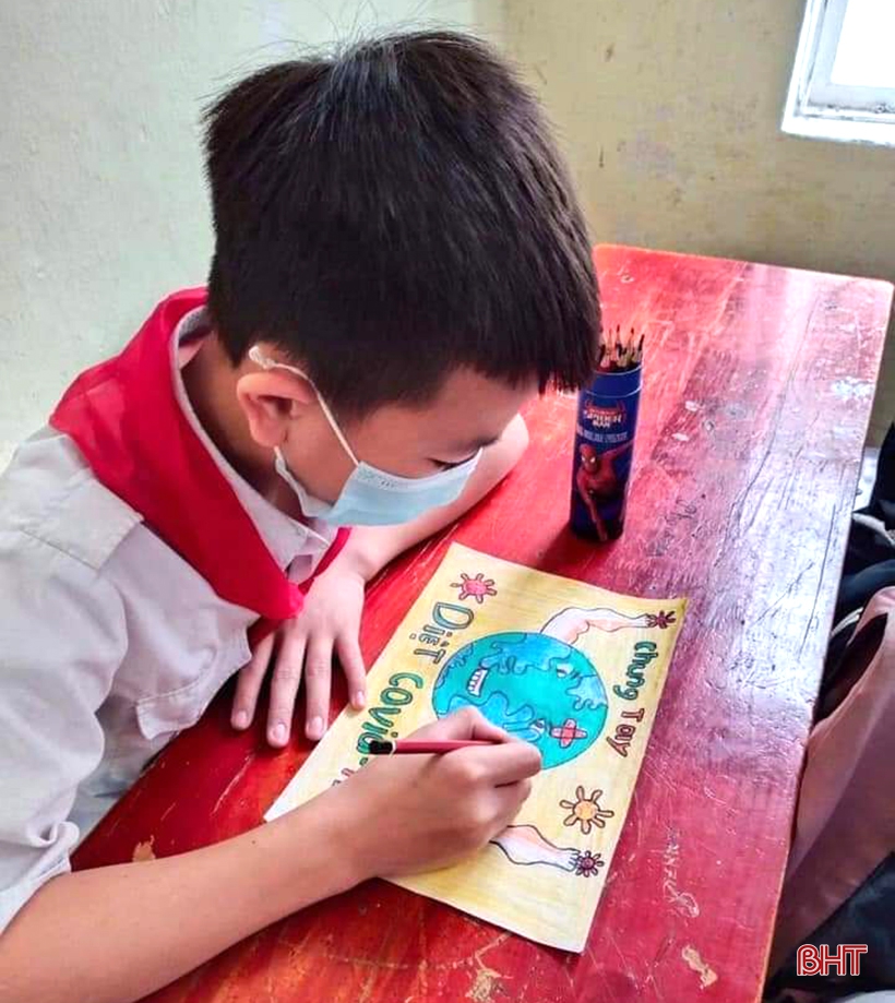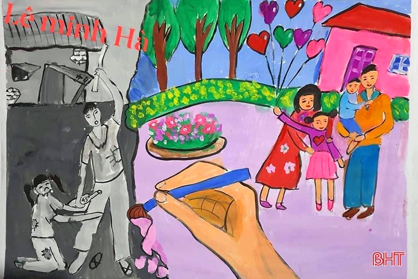 Cùng với các thông điệp trong phòng, chống dịch Covid-19, nhiều học sinh đã gửi gắm tới mọi người nhiều thông điệp ý nghĩa trong cuộc sống. Em Lê Minh Hà (lớp 3A3, Trường Tiểu học Đức Thuận, TX Hồng Lĩnh) với mong muốn “Hãy vẽ thật nhiều sắc màu tươi đẹp của yêu thương, hạnh phúc để xoá đi những mảng tối của bạo lực gia đình, xâm hại, bỏ rơi...”