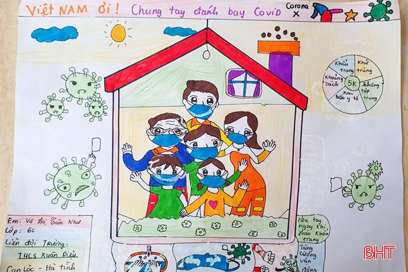 Bức tranh mang thông điệp “Thiếu nhi Bắc Hà, cùng nhau đoàn kết đẩy lùi Covid-19, mừng sinh nhật Đội ta 80 mùa hoa! “ của học sinh Hoàng Bảo Vân (lớp 3A, Trường Tiểu học Bắc Hà, TP Hà Tĩnh)