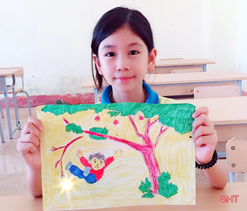Bức tranh của em Phan Thanh Khánh Hà (Trường Tiểu học Đức Thanh, Đức Thọ) nhắn nhủ các bạn: “Mùa hè đến rồi các bạn hãy nói không với ao hồ, sông suối, không leo trèo lên cây bên các ao hồ lớn, có thể gây hậu quả khó lường. Chúc các bạn một kỳ nghỉ hè an toàn, bổ ích”.