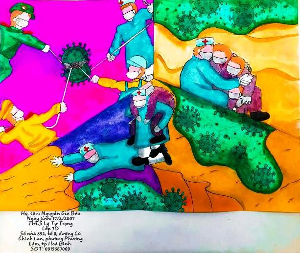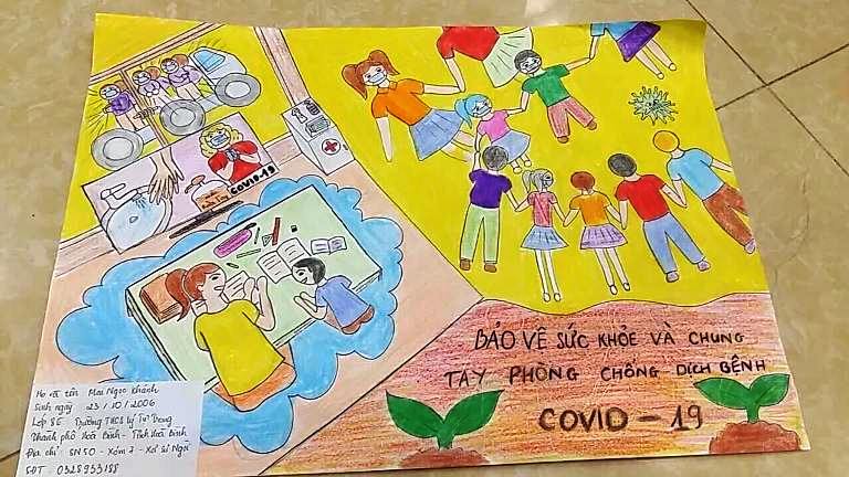 Tranh vẽ của học sinh thể hiện việc chung tay đẩy lùi dịch Covid -19
