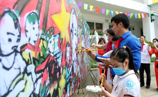 Đồng chí Nguyễn Ngọc Lương, Bí thư TƯ Đoàn, Chủ tịch Hội đồng Đội TƯ cùng các em thiếu nhi vẽ tranh hưởng ứng cuộc thi