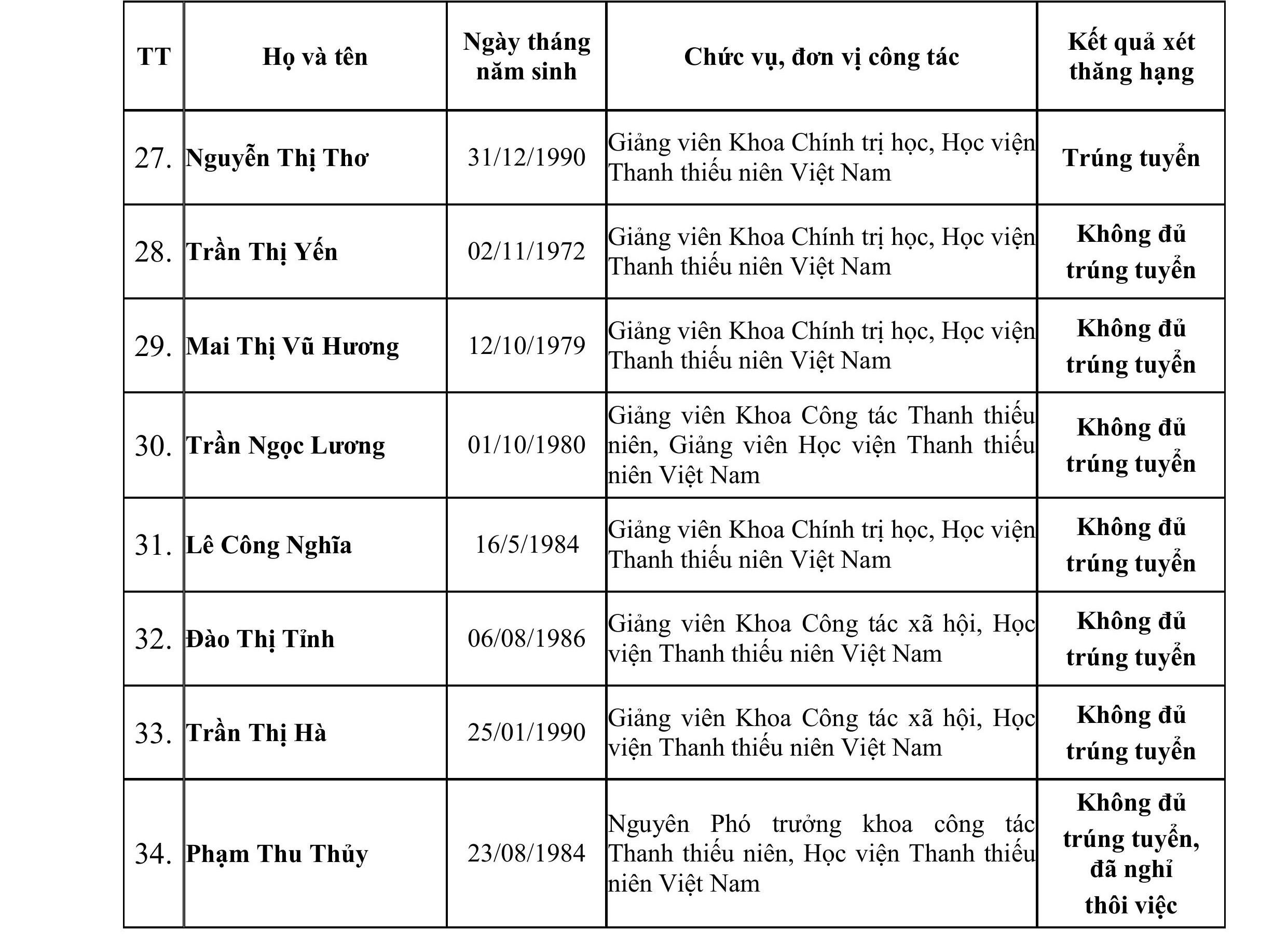 Căn cứ Quyết định số 923 -QĐ/TWĐTN-BTC ngày 19/12/2024 của Bí thư Thứ nhất Trung ương Đoàn về việc phê duyệt kết quả xét thăng hạng chức danh nghề nghiệp Chuyên viên chính và Giảng viên hạng II tại các đơn vị sự nghiệp thuộc cơ quan Trung ương Đoàn năm 2024, Hội đồng xét thăng hạng viên chức hạng II cơ quan Trung ương Đoàn năm 2024 thông báo kết quả xét thăng hạng viên chức hạng II như sau: