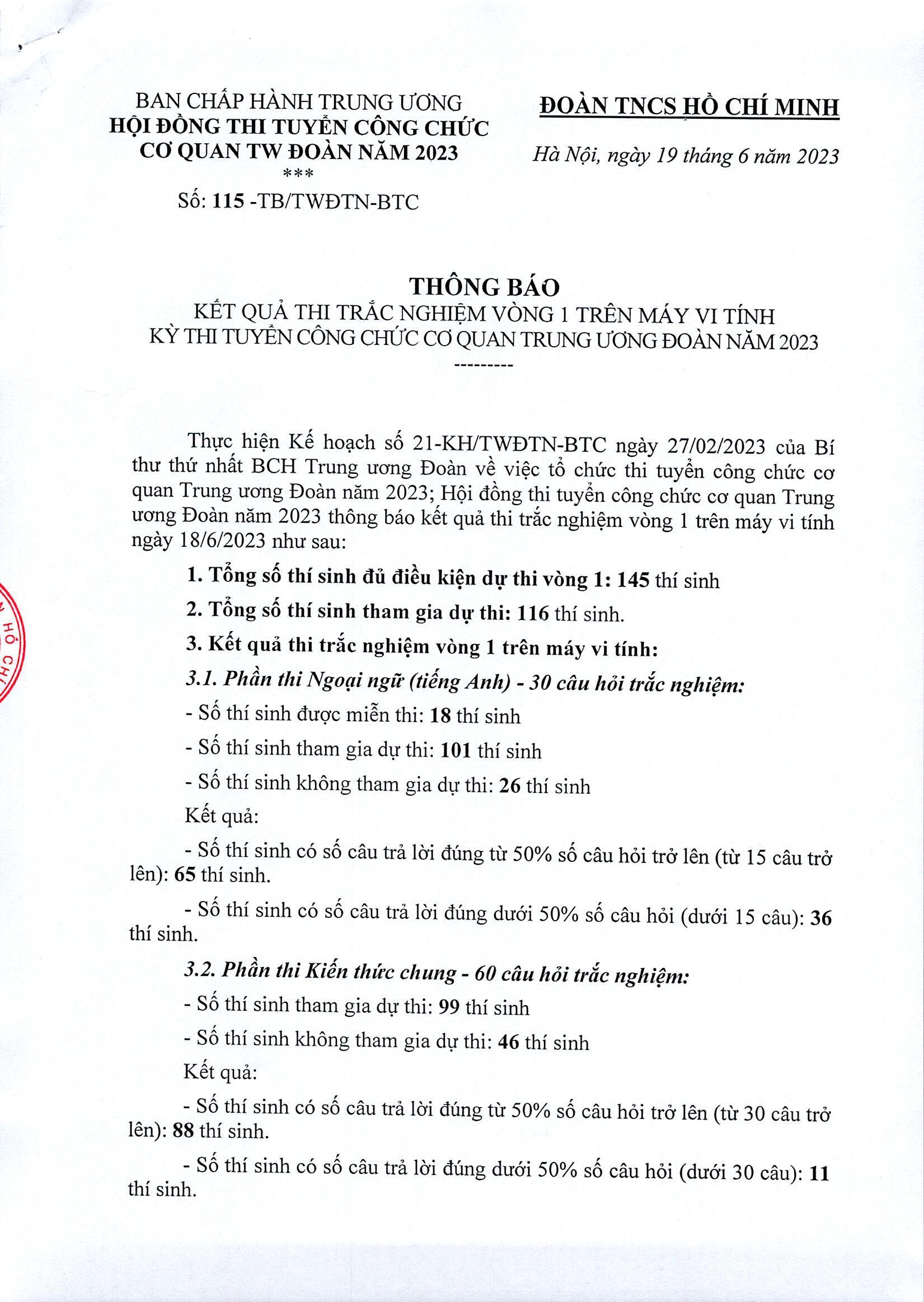 Thông báo kết quả thi trắc nghiệm vòng 1 trên máy vi tính kỳ thi tuyển công chức cơ quan TW Đoàn năm 2023. Xem toàn bộ tại đây