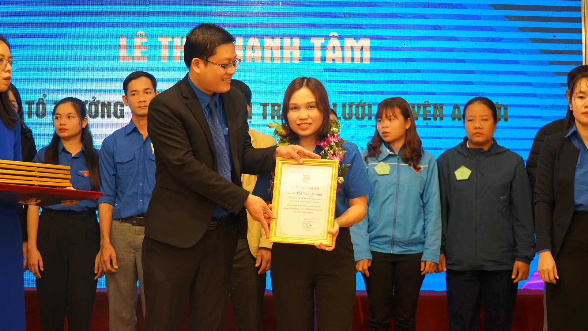 Đồng chí Nguyễn Thanh Hoài - UVBCH Trung ương Đoàn, Bí thư Tỉnh Đoàn, Chủ tịch Hội LHTN Việt Nam tỉnh trao tặng giấy chứng nhận cho các Tổ trưởng Tổ Tiết kiệm và vay vốn giỏi