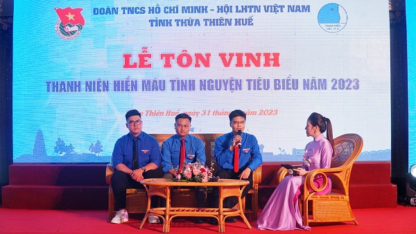 Chương trình đã lắng nghe những chia sẻ, giao lưu với các gương điển hình trong phong trào hiến máu tình nguyện của tuổi trẻ toàn tỉnh: Đồng chí Nguyễn Minh Hành - UVBCH Tỉnh Đoàn, Bí thư Đoàn Bệnh viện Trung ương Huế; đồng chí Phan Tuấn Vũ - Bí thư Đoàn xã, Chủ tịch Hội LHTN Việt Nam xã Thủy Phù, thị xã Hương Thủy và đồng chí Tôn Thất Hoàn Vũ - Lớp trưởng YHCT18-24A, Chủ nhiệm CLB Y Học Cổ Truyền - Y Dược Huế.