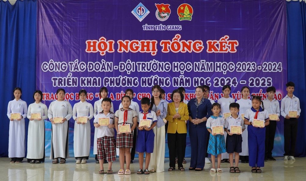 Nhằm kịp thời động viên, hỗ trợ các em đoàn viên, đội viên, học sinh có hoàn cảnh khó khăn vượt khó học tốt, trong chương trình, Quỹ học bổng Vừ A Dính trao 60 suất học bổng (1 triệu đồng/suất) cho 60 em học sinh của đơn vị huyện Cái Bè, huyện Gò Công Đông và huyện Tân Phú Đông.