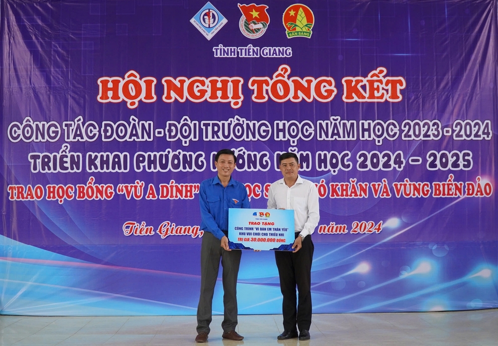 Tỉnh đoàn Tiền Giang trao tặng công trình “Vì đàn em thân yêu” khu vui chơi thiếu nhi cho huyện Cái Bè, trị giá 30 triệu đồng. Đoàn cơ sở Công ty TNHH MTV Xổ số kiến thiết Tiền Giang và Chi đoàn cơ sở Viện Kiểm sát nhân dân tỉnh Tiền Giang trao tặng cho huyện Cái Bè 1.000 quyển tập để tặng đến các em học sinh vượt khó học tốt trong năm học mới. Nha khoa 5S trao Bảng tượng trưng đồng hành, hỗ trợ hoạt động an sinh xã hội cho trường học và chương trình chăm sóc răng cho cán bộ Đoàn trường học./.