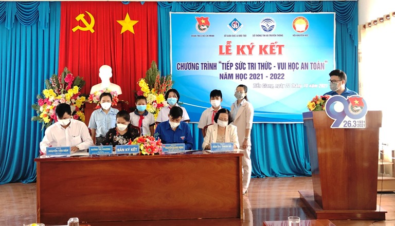 Chương trình “Tiếp sức tri thức - Vui học an toàn” năm học 2021 - 2022 được triển khai từ tháng 10/2021 đến khi công bố hết dịch Covid-19 tại tất cả các huyện, thành, thị trên địa bàn tỉnh Tiền Giang với các đối tượng là đoàn viên, đội viên, học sinh gặp khó khăn về điều kiện học tập, các thiết bị học tập trực tuyến; trẻ em, học sinh mồ côi cha hoặc mẹ vì Covid-19 trên địa bàn tỉnh. Chương trình được triển khai với các nội dung chính: Vận động các nguồn lực hỗ trợ học bổng, trang thiết bị học tập, dụng cụ học trực tuyến cho học sinh; Tổ chức các Câu lạc bộ giáo viên hỗ trợ học sinh học trực tuyến; Xây dựng các Câu lạc bộ học tập, nhóm học tập trực tuyến nhằm hỗ trợ cho học sinh trong quá trình tham gia học trực tuyến…