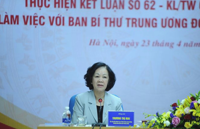 Phát biểu tại buổi làm việc, đồng chí Trương Thị Mai, Ủy viên Bộ Chính trị, Bí thư Trung ương Đảng, Trưởng ban Dân vận Trung ương đánh giá cao những nỗ lực của Trung ương Đoàn trong thực hiện Kết luận 62 của Bộ Chính trị.
