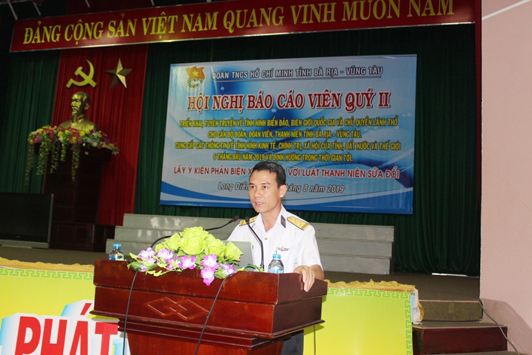 Tại Hội nghị các đại biểu được đồng chí Trung tá Phạm Ngọc Quý – Trưởng ban Tuyên huấn Bộ Tư lệnh Vùng 2 Hải quân thông tin về tình hình biển đảo, biên giới quốc gia và chủ quyền lãnh thổ hiện nay, cụ thể vừa qua việc Trung Quốc xâm phạm vùng đặc quyền kinh tế và thềm lục địa của Việt Nam.