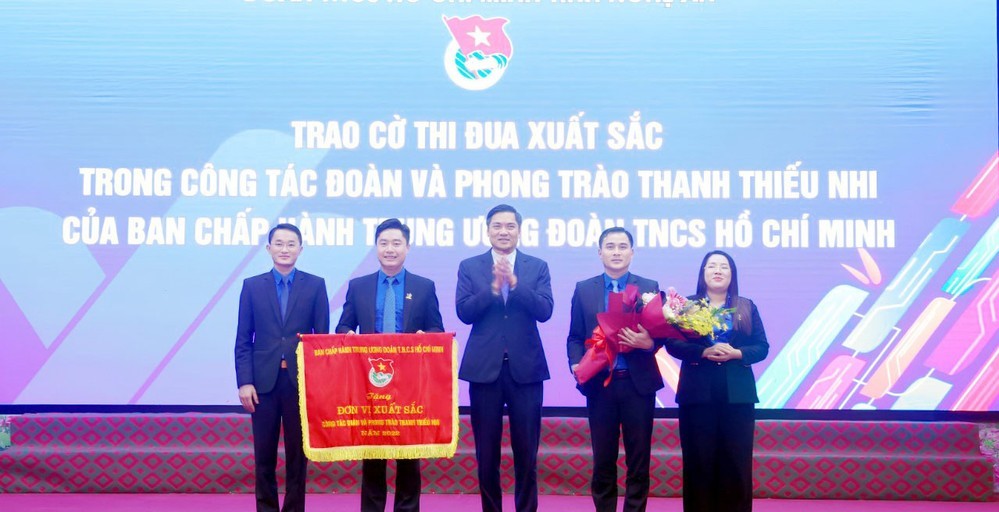 Phó Bí thư Tỉnh ủy Hoàng Nghĩa Hiếu trao tặng Cờ thi đua đơn vị xuất sắc do Trung ương Đoàn trao tặng Tỉnh đoàn Nghệ An.