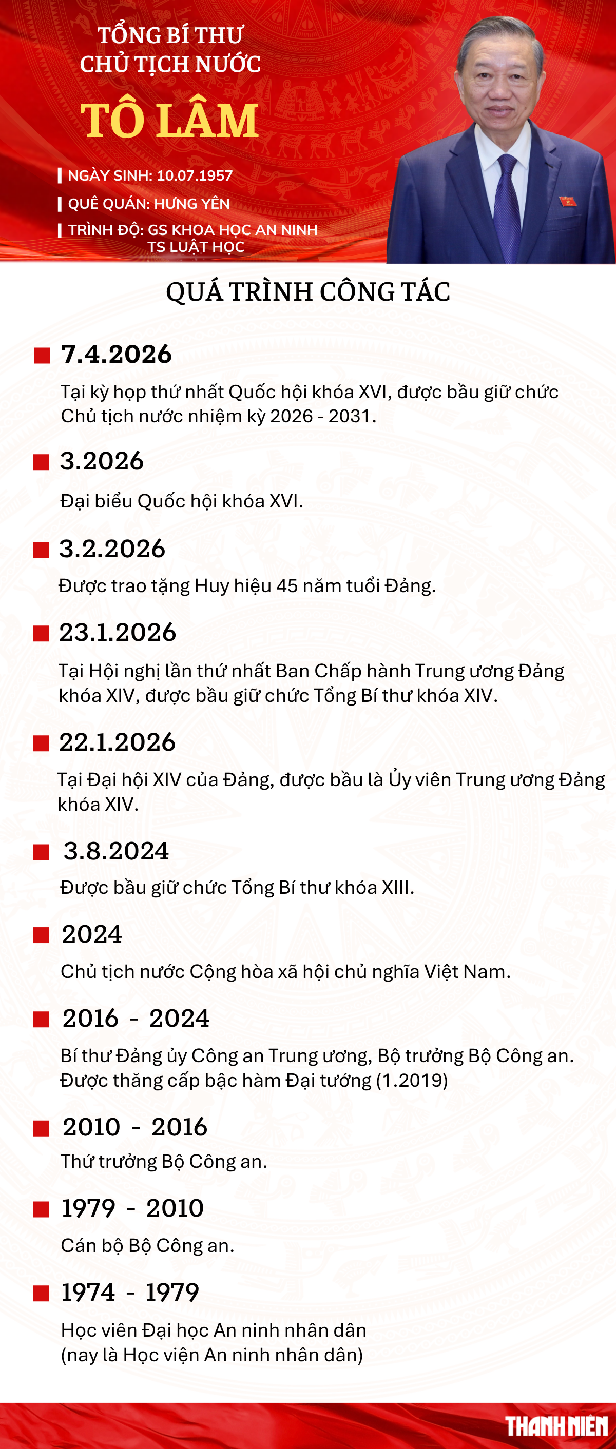 "Dưới cờ đỏ sao vàng thiêng liêng của Tổ quốc, trước Quốc hội, đồng bào và cử tri cả nước, tôi - Chủ tịch nước Cộng hòa xã hội chủ nghĩa Việt Nam, xin tuyên thệ: Tuyệt đối trung thành với Tổ quốc, với nhân dân, với Hiến pháp nước Cộng hòa xã hội chủ nghĩa Việt Nam, nỗ lực phấn đấu hoàn thành tốt mọi nhiệm vụ mà Đảng, Nhà nước và nhân dân giao phó", Tổng Bí thư, Chủ tịch nước Tô Lâm tuyên thệ.
