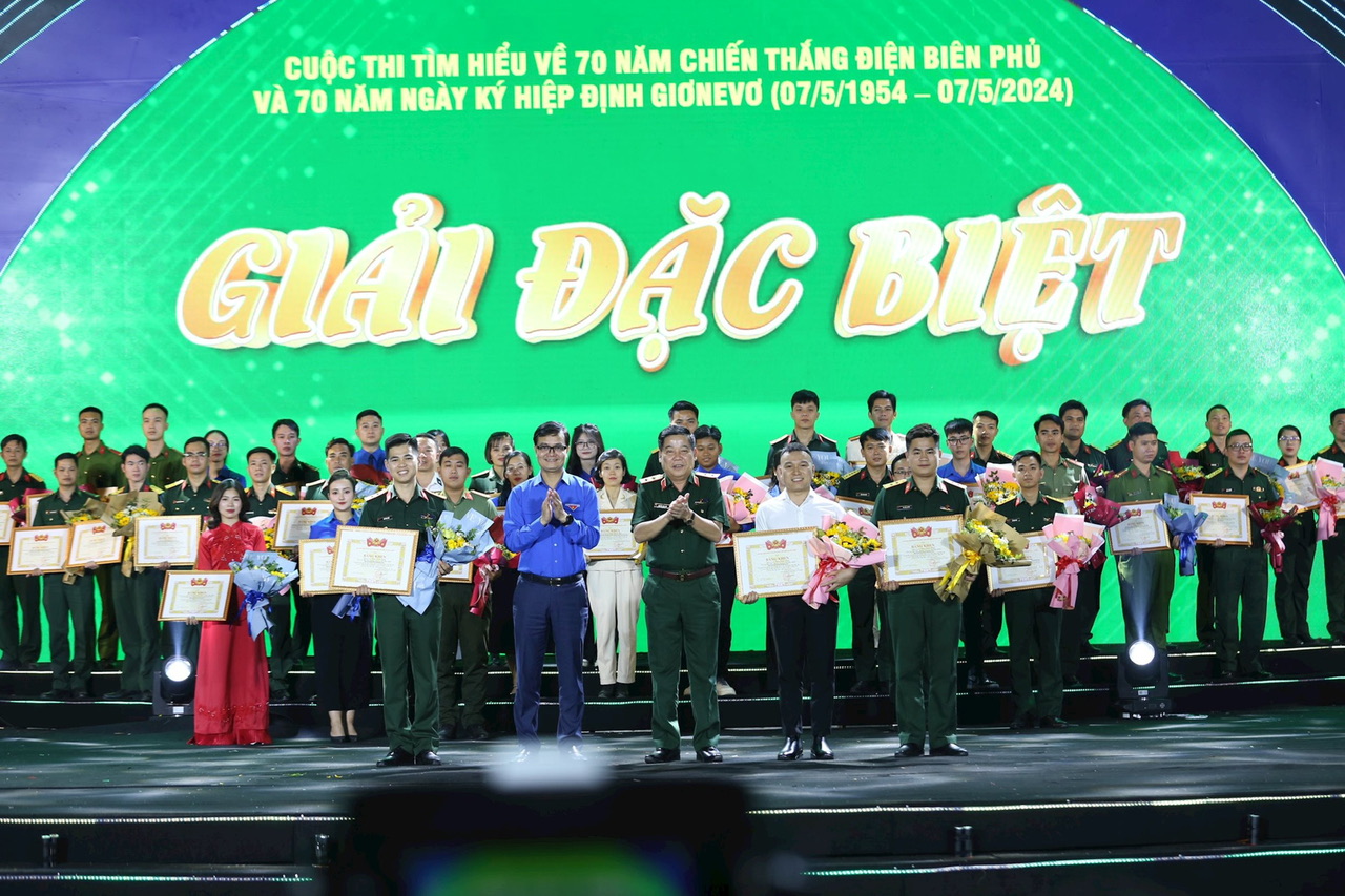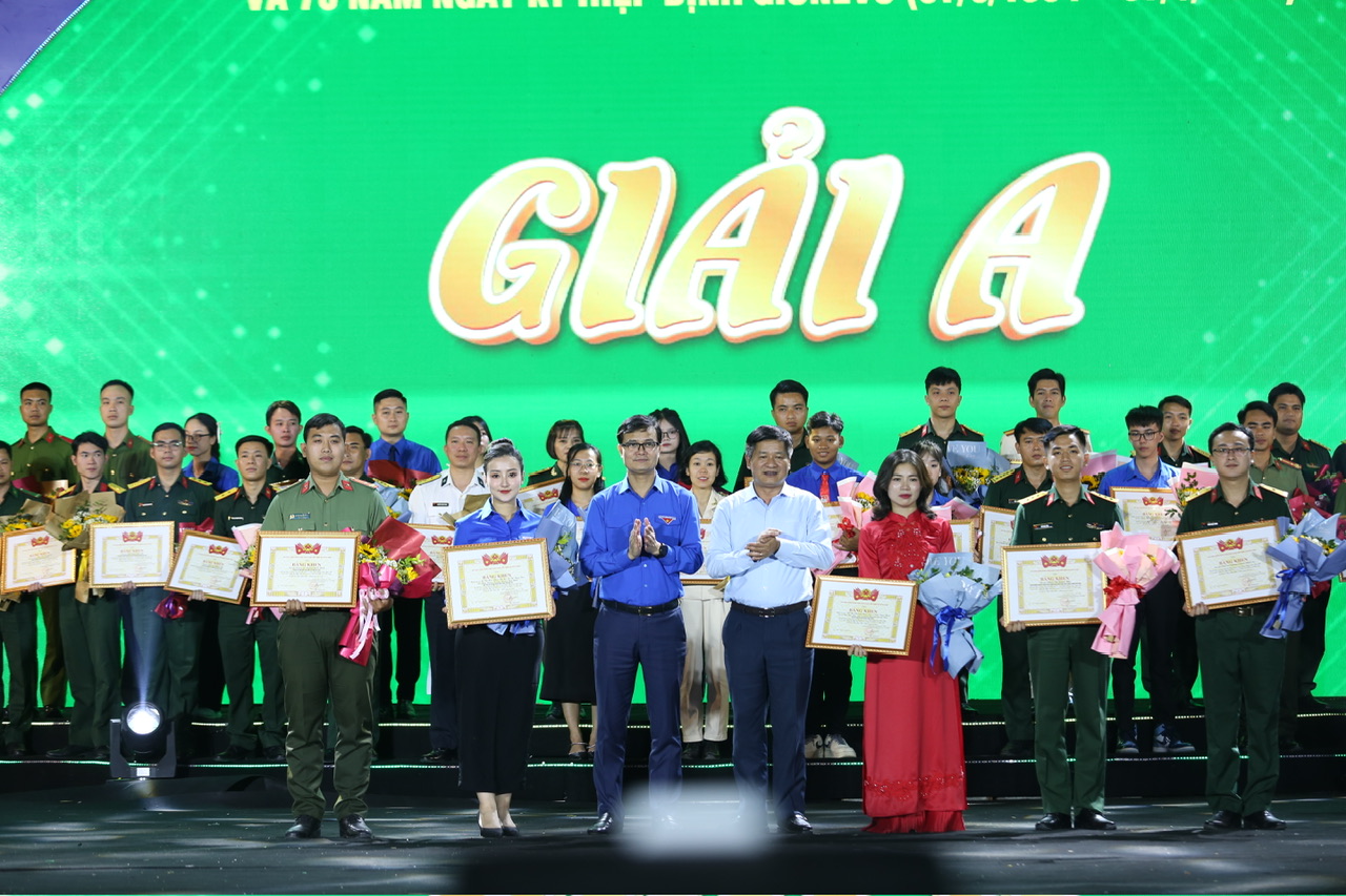Trung tướng Nguyễn Văn Gấu, Uỷ viên Trung ương Đảng, Uỷ viên Quân ủy Trung ương, Phó Chủ nhiệm Tổng cục Chính trị QĐND Việt Nam và đồng chí Bùi Quang Huy - Uỷ viên dự khuyết T.Ư Đảng, Bí thư thứ nhất T.Ư Đoàn trao Giải A cho các tác giả.