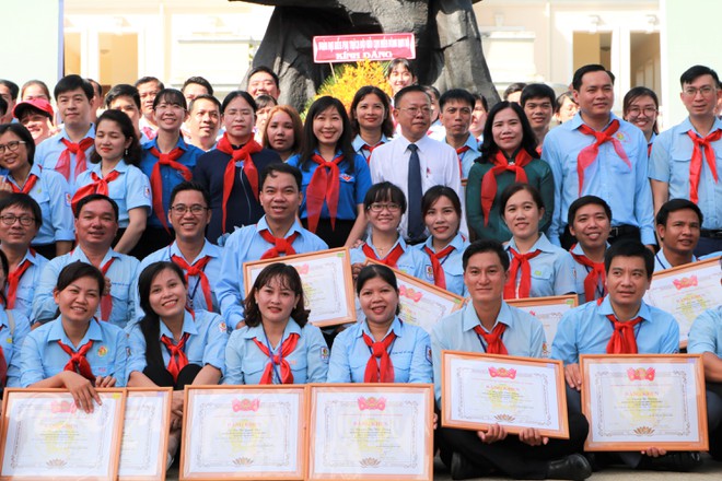 Bí thư T.Ư Đoàn, Chủ tịch Hội đồng Đội T.Ư Nguyễn Ngọc Lương (giữa), tuyên dương Tổng phụ trách Đội giỏi trong cụm miền Đông Nam bộ có thành tích xuất sắc