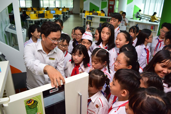 Các em đội viên hào hứng tìm hiểu máy rửa sách tại thư viện "Truyền cảm hứng" trường Đại học Tôn Đức Thắng