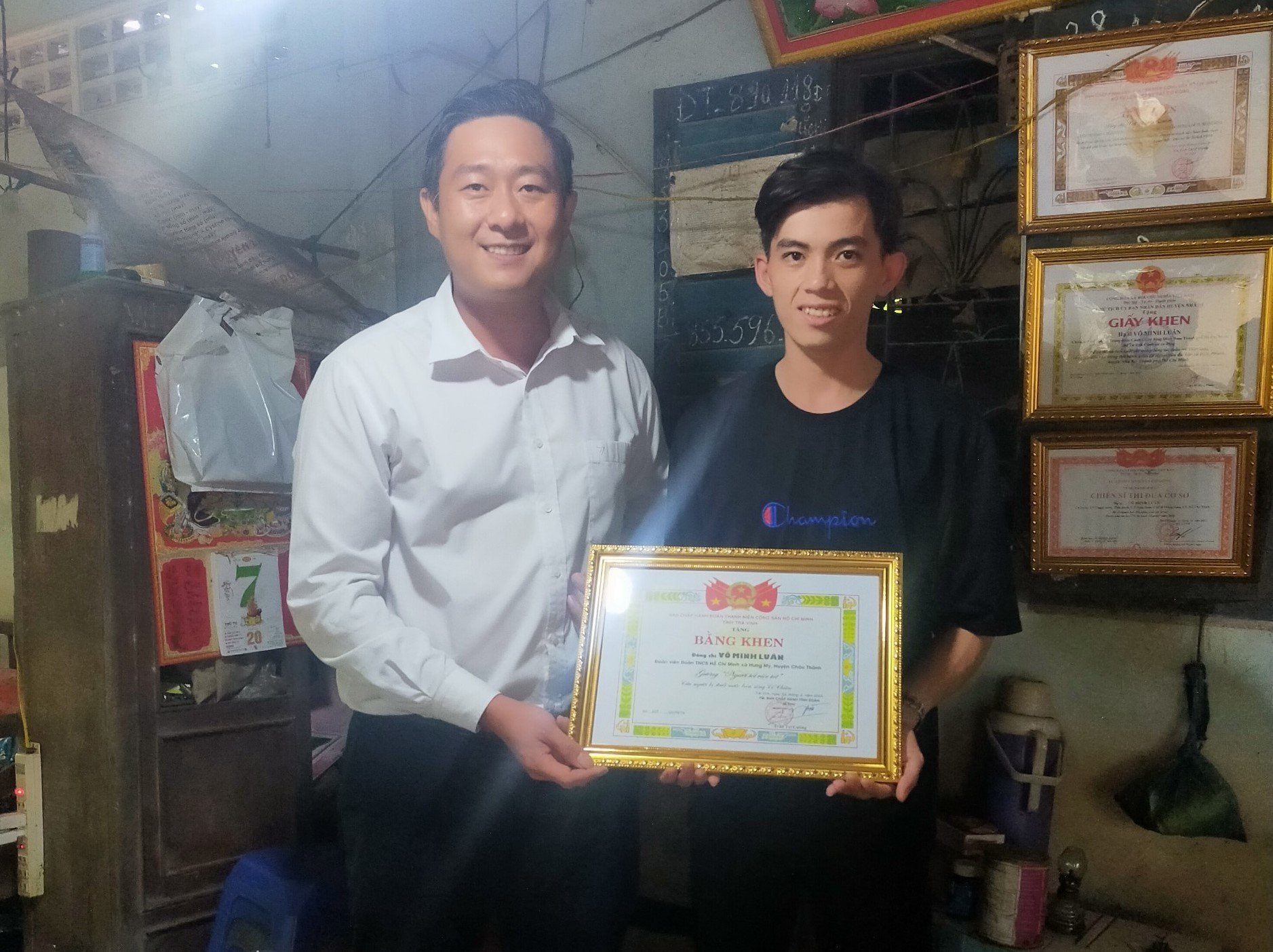 Đồng chí Thái Văn Chuẩn, Ủy viên Thường vụ Tỉnh đoàn thay mặt Ban Chấp hành Tỉnh đoàn trao Bằng khen gương “Người tốt việc tốt” cho đồng chí Võ Minh Luân