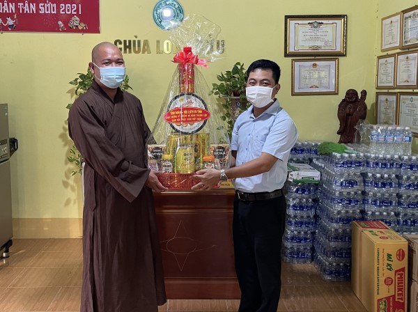 Anh Võ Minh Nhựt - Phó Bí thư Thường trực Tỉnh đoàn, Chủ tịch Hội LHTN Việt Nam tỉnh tặng quà chúc mừng Đại đức Thích Minh Trí - Trụ trì chùa Long Bửu