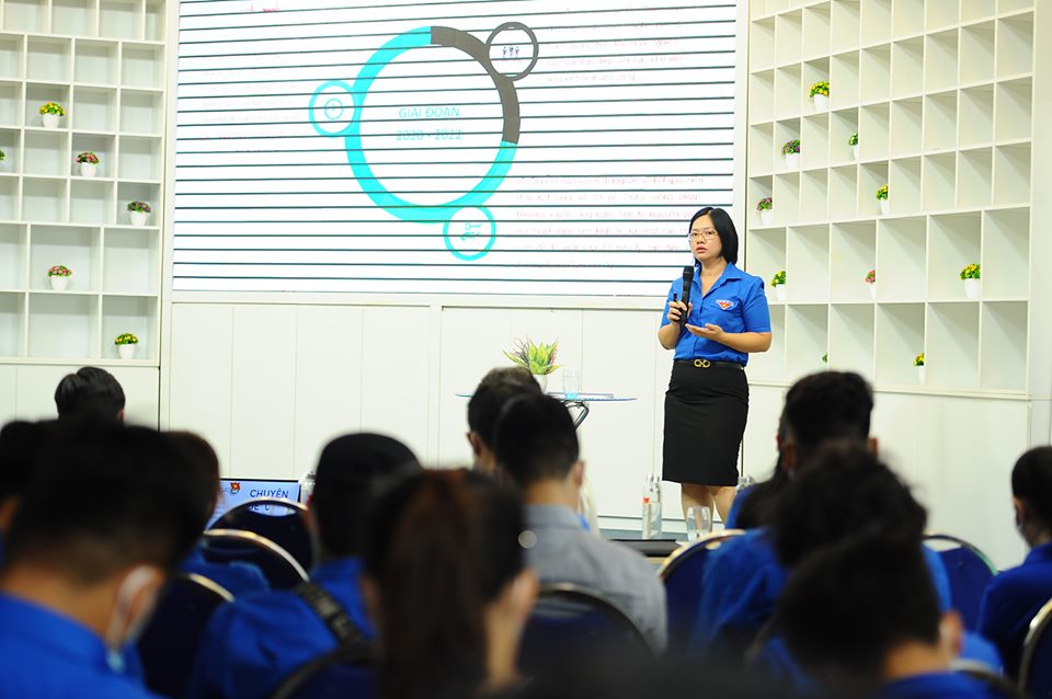 Chị Nguyễn Thị Thu Vân, Trưởng ban Thanh niên nông thôn T.Ư Đoàn báo cáo chuyên đề triển khai thực hiện Kết luận số 03 của Hội nghị BCH T.Ư Đoàn khóa XI về tăng cường hỗ trợ thanh niên làm kinh tế giai đoạn 2018- 2020