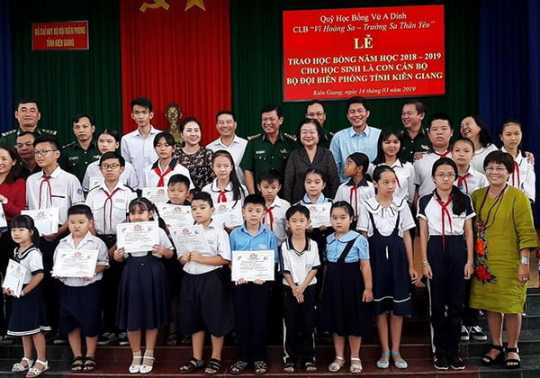 Đồng chí Trương Mỹ Hoa - Nguyên Phó Chủ tịch nước Cộng hòa Xã hội Chủ nghĩa Việt Nam, Chủ tịch Quỹ học bổng Vừ A Dính, Chủ nhiệm Câu lạc bộ “Vì Hoàng Sa - Trường Sa thân yêu” chụp hình lưu niệm với Lãnh đạo Tỉnh đoàn, Lãnh đạo Bộ Chỉ huy Bộ đội Biên phòng tỉnh, các nhà tài trợ và các em học sinh là của các cán bộ, chiến sỹ bộ đội Biên phòng tỉnh Kiên Giang được nhận học bổng của Câu lạc bộ “Vì Hoàng Sa - Trường Sa thân yêu”.