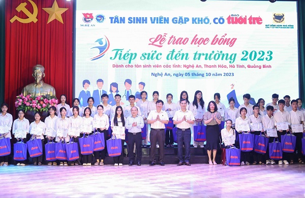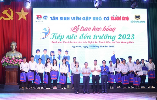 Đây là điểm trao thứ hai trong chương trình học bổng “Tiếp sức đến trường” năm 2023 dành cho tân sinh viên thuộc chương trình “Vì ngày mai phát triển” của Báo Tuổi trẻ và các đơn vị đồng hành