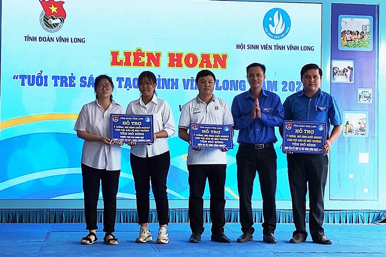Hỗ trợ 03 ý tưởng khởi nghiệp, mô hình khởi nghiệp, lập nghiệp của thanh niên trong lĩnh vực bảo vệ môi trường, ứng phó biến đổi khí hậu cho bạn Đoàn Trung Thông, phường 3, thành phố Vĩnh Long với mô hình tổ hợp tác Dịch vụ vệ sinh công nghiệp; bạn Nguyễn Hà Bích Ngọc - Nguyễn Bảo Ngọc, học sinh trường Trường THPT Nguyễn Thông - TP Vĩnh Long với ý tưởng Thuốc trừ sâu sinh học chiếc xuất từ cây “môn trường sinh”; bạn Sơn Sang, đoàn viên xã Xã Đông Thạnh - Bình Minh với mô hình Nuôi ếch kết hợp cá Trê vàng công nghệ xanh, thân thiện môi trường. Ngoài ra, Tỉnh đoàn đã đến tận mô hình và hỗ trợ cho 02 mô hình của bạn Nguyễn Ngọc Tân, thanh niên Khóm 1, thị trấn Long Hồ với mô hình nuôi Lươn không bùn; bạn Nguyễn Văn Thảo, đoàn viên xã Thuận Thới, huyện Trà Ôn với mô hình Nuôi Bò kết hợp với nuôi trùng quế.