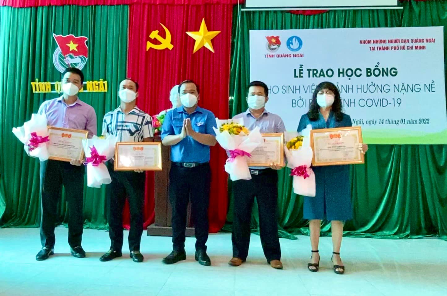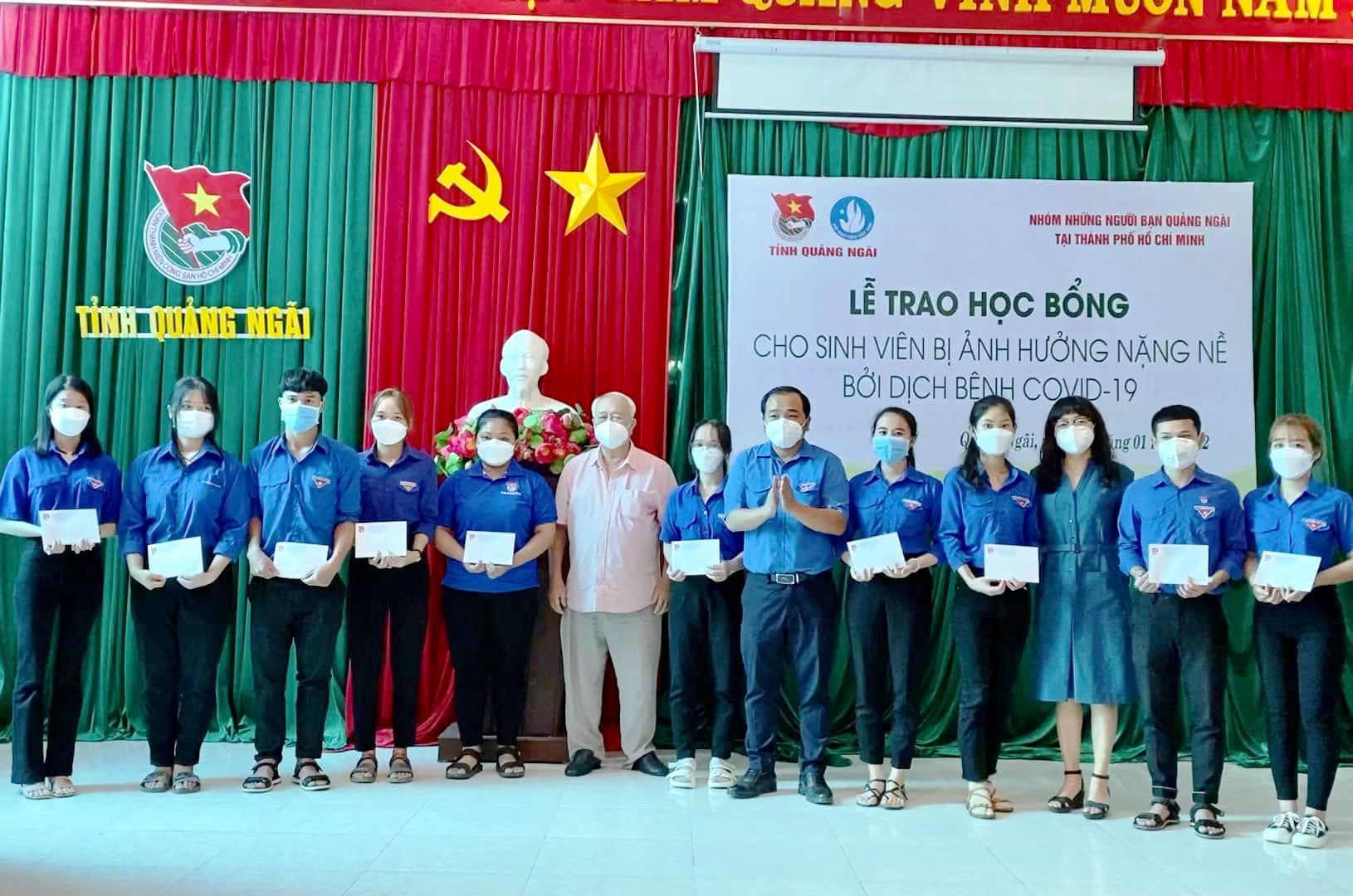 Chiều cùng ngày, tại cơ quan Tỉnh đoàn Quảng Ngãi, Nhóm Những người bạn Quảng Ngãi tại TP.HCM đã trao tặng 20 suất học bổng, mỗi suất 1 triệu đồng cho 20 sinh viên các trường Đại học Phạm Văn Đồng và Tài chính – Kế toán bị ảnh hưởng nặng nề bởi dịch bệnh COVID-19.