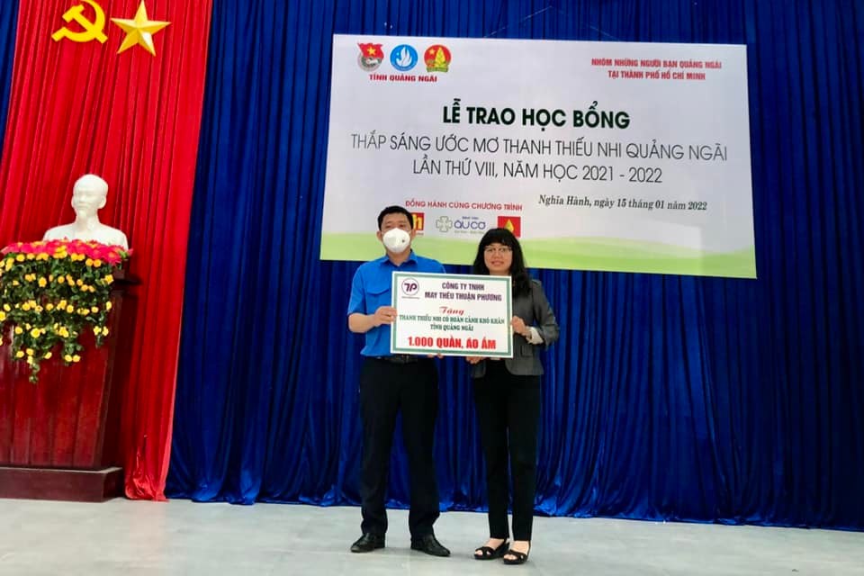 Trong chương trình “Thắp sáng ước mơ thanh thiếu nhi Quảng Ngãi” lần này, Công ty TNHH May thêu Thuận Phương một đơn vị thành viên Nhóm những người bạn Quảng Ngãi tại TP.HCM cũng dành tặng cho các em học sinh Quảng Ngãi có hoàn cảnh khó khăn 1.000 bộ quần áo ấm.