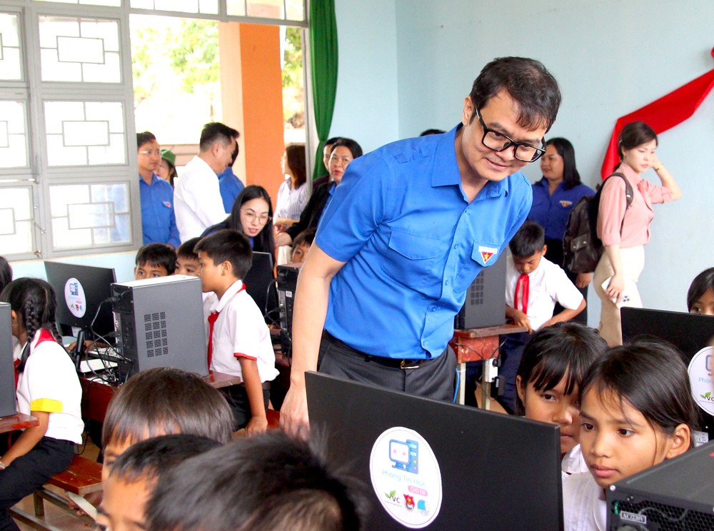 Tiếp đó, đoàn công tác của Bí thư thứ nhất Trung ương Đoàn đến tặng 1 “Phòng Tin học cho em” tại Trường Tiểu học Lê Lai cơ sở 2 (xã Chư Á, thành phố Pleiku).