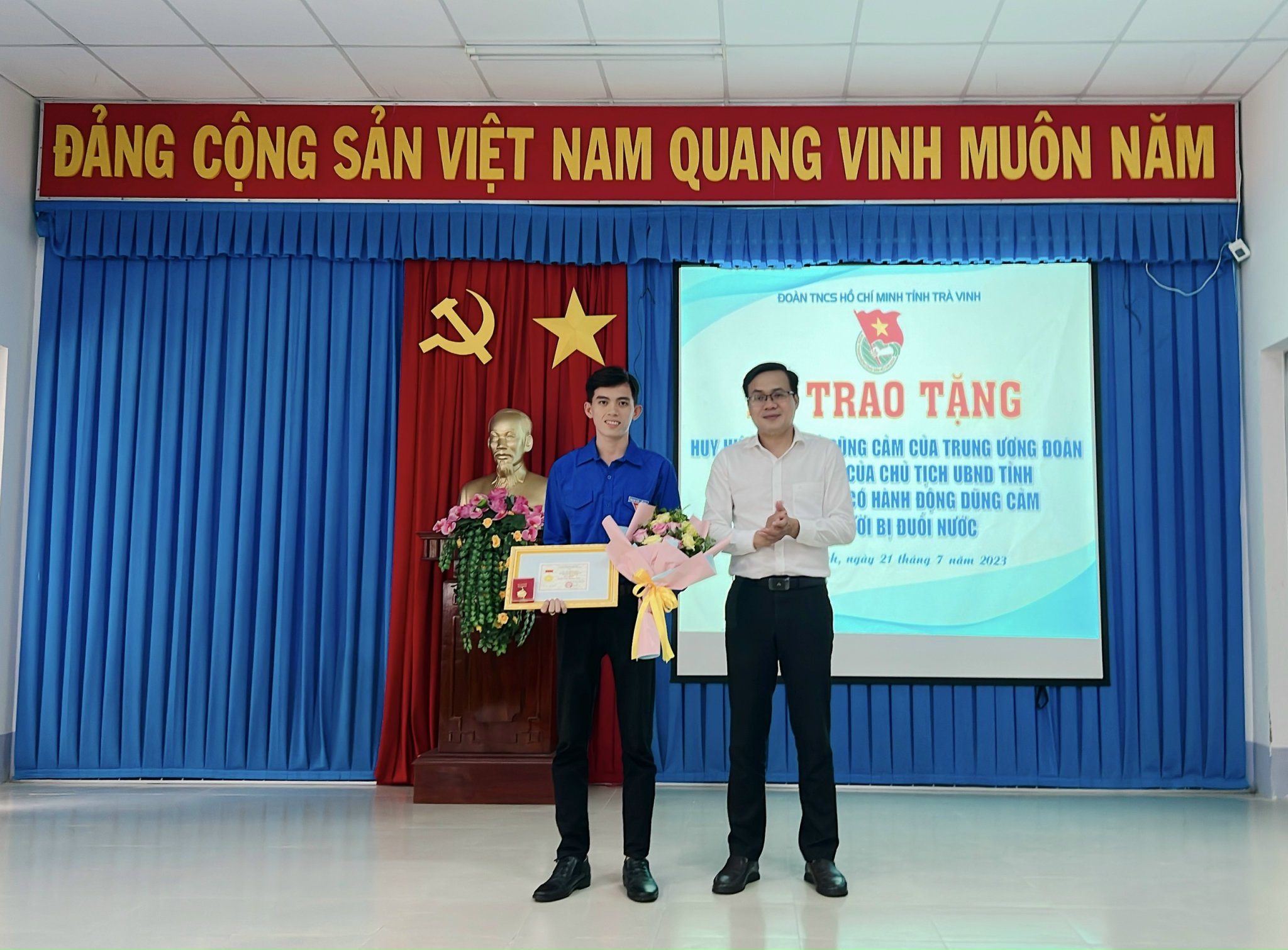 Đồng chí Nguyễn Thanh Nhã, Phó Bí thư Tỉnh đoàn trao tặng Huy hiệu “Tuổi trẻ Dũng cảm” của Trung ương Đoàn cho đồng chí Võ Minh Luân