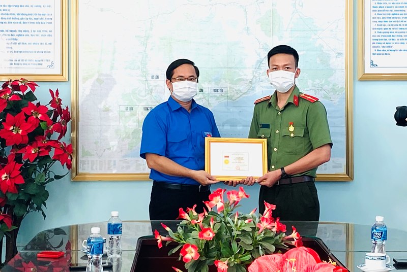 Đồng chí Nguyễn Quốc Huy - UVBCH Trung ương Đoàn, Phó Bí thư Tỉnh đoàn trao huy hiệu Tuổi trẻ dũng cảm cho đồng chí Trần Minh Châu