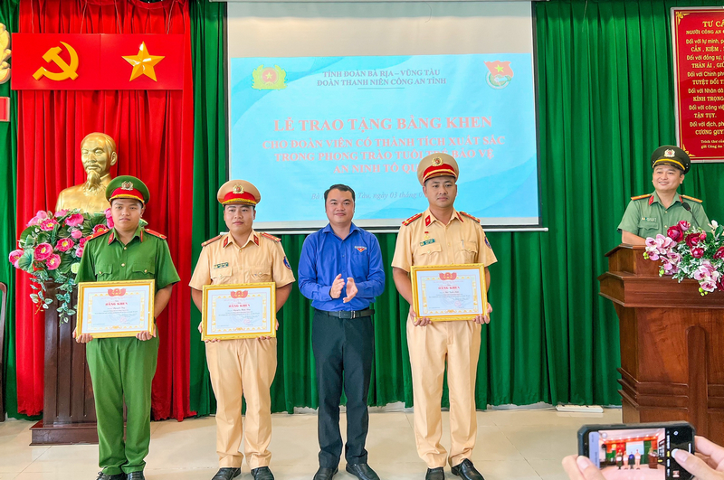 Cụ thể, đồng chí Thôi Đại Việt - Phó Bí thư Tỉnh đoàn đã trao Bằng khen của Ban Chấp hành Đoàn tỉnh Bà Rịa - Vũng Tàu đối với 03 đồng chí Đoàn Thanh niên Công an tỉnh đã có thành tích xuất sắc trong công tác đấu tranh phòng chống tội phạm bảo đảm an ninh trật tự gồm: Bùi Tuấn Anh, Nguyễn Khắc Duy - đoàn viên Chi đoàn cơ sở Phòng cảnh sát giao thông Công an tỉnh và Nguyễn Túy - đoàn viên Đoàn cơ sở Phòng cảnh sát cơ động Công an tỉnh.
