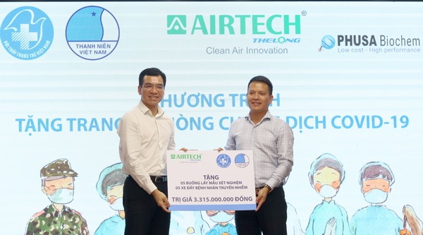 Đại diện lãnh đạo Công ty Airtech Thế Long Trao biển hỗ trợ trang thiết bị phòng chống dịch COVID - 19 cho Hội Thầy thuốc trẻ Việt Nam.