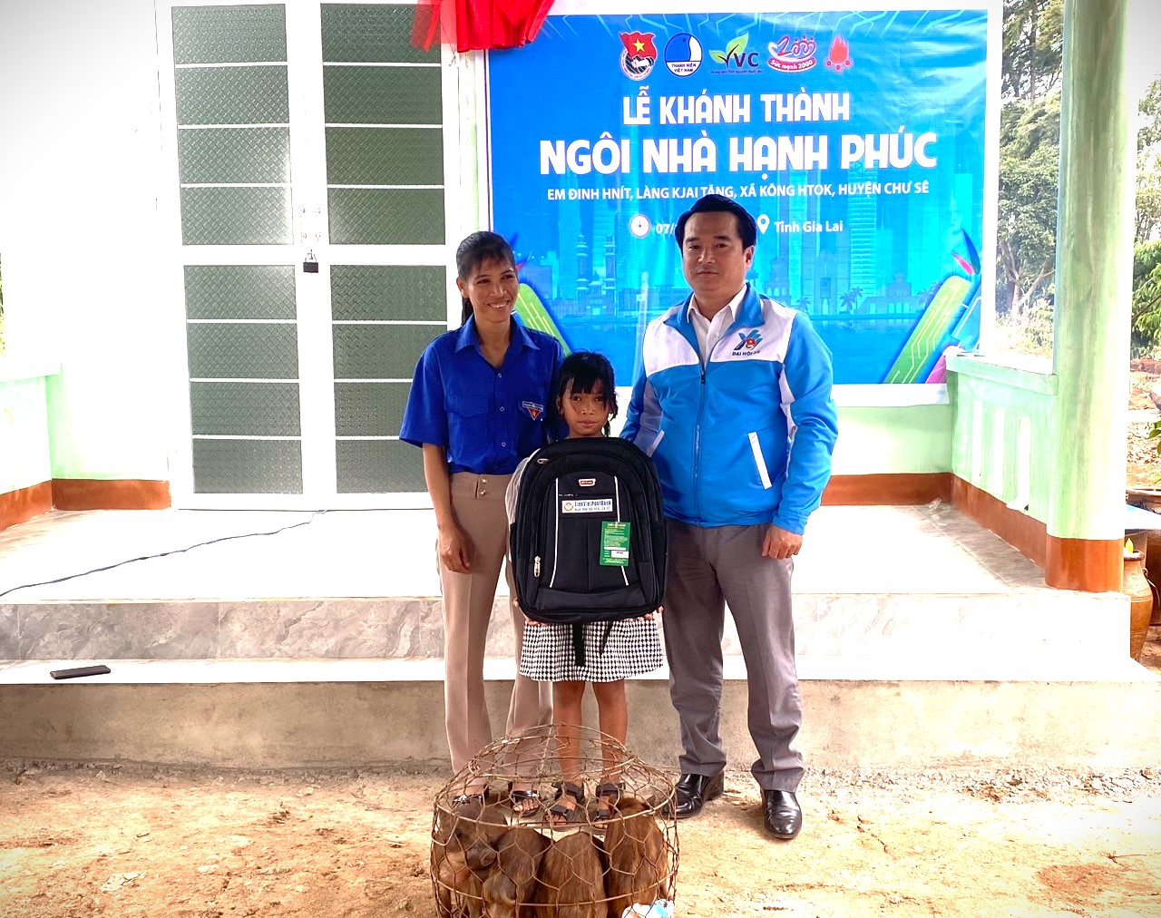 Anh Đỗ Duy Nam, Phó Bí thư tỉnh đoàn Gia Lai trao quà và chìa khóa nhà cho em Đinh Hnit