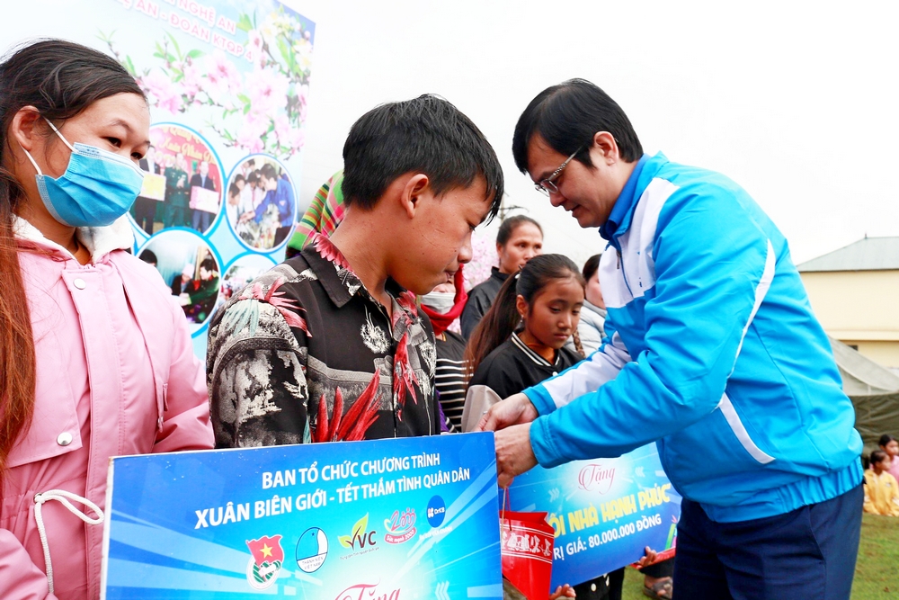 Đồng chí Bùi Quang Huy, Ủy viên dự khuyết T.Ư Đảng, Bí thư thứ nhất T.Ư Đoàn tặng quà cho thanh thiếu nhi và người dân có hoàn cảnh khó khăn trong chương trình “Xuân biên giới – Tết thắm tình quân dân” tại xã biên giới Tri Lễ, huyện Quế Phong, tỉnh Nghệ An nhân dịp Xuân Quý Mão năm 2023. Ảnh: Bảo Anh