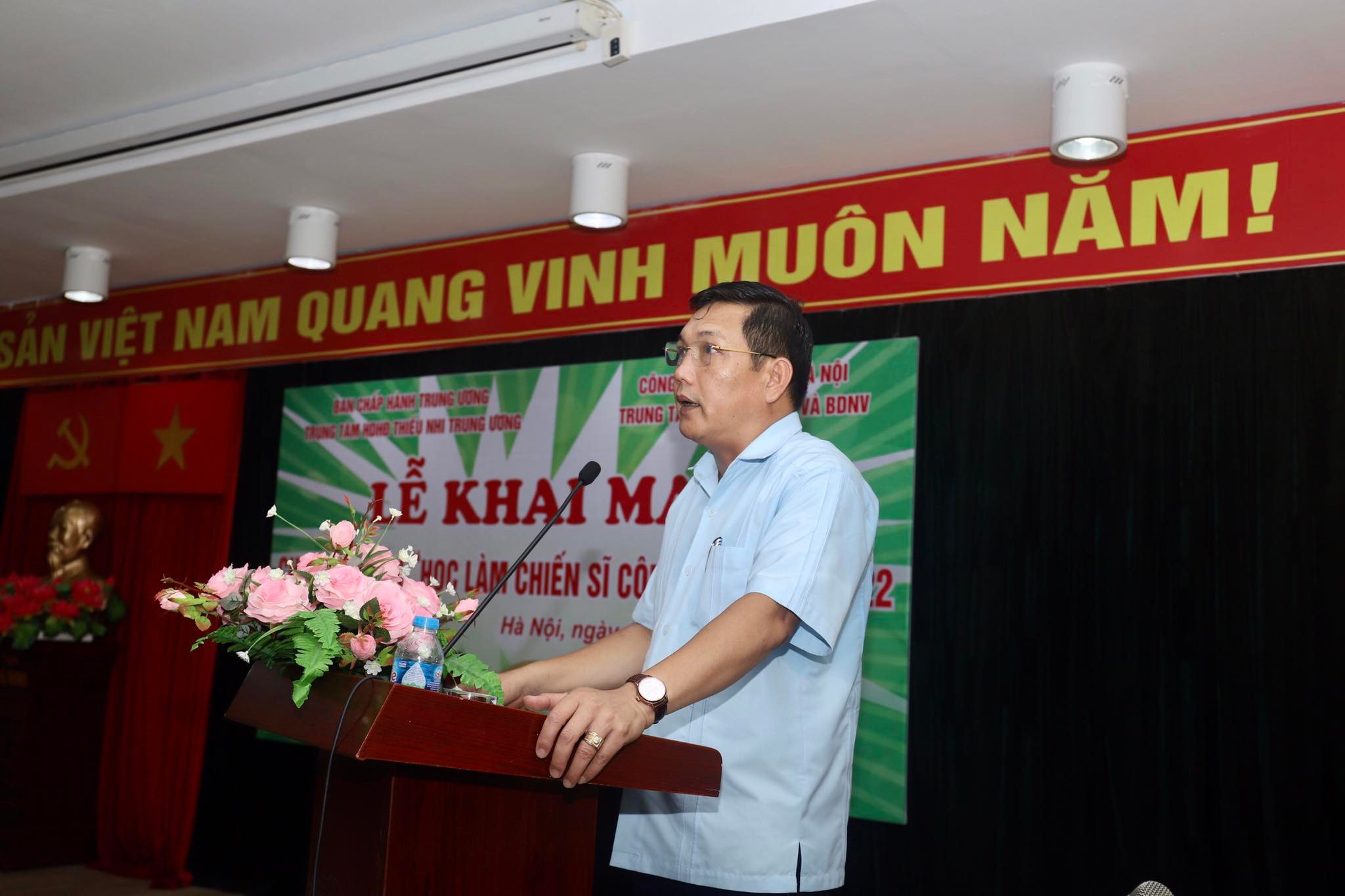Đồng chí Nguyễn Đình Kiểm, Giám đốc Trung tâm Hướng dẫn hoạt động Thiếu nhi Trung ương phát biểu tại chương trình