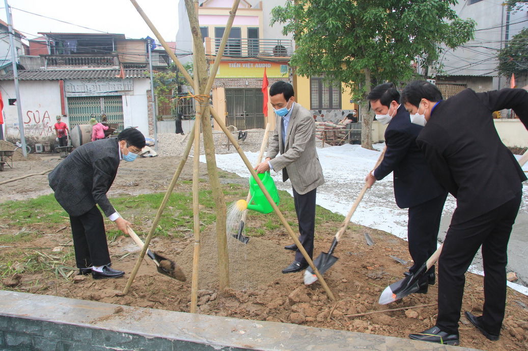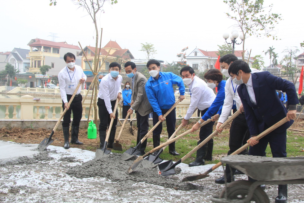 Các đại biểu, đoàn viên thanh niên tham gia khởi công sân chơi và trồng cây xanh tại công trình.