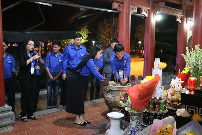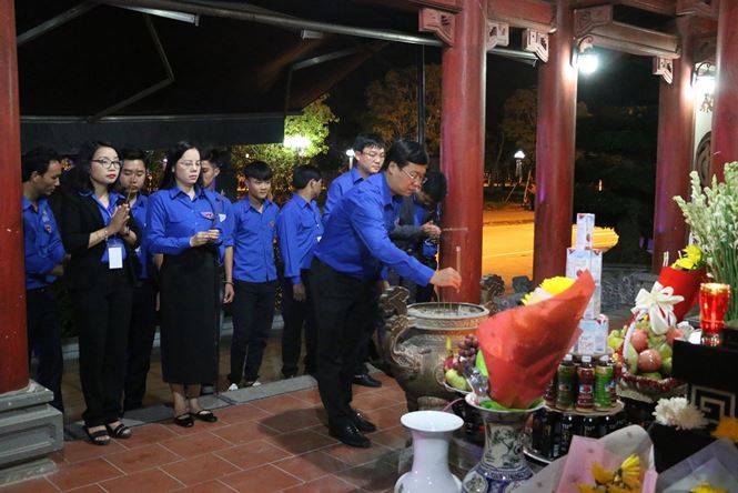Các đồng chí: Trần Minh Huyền - Ủy viên BTV, Trưởng ban TNXP Trung ương Đoàn; Phạm Tuấn Vinh - Bí thư tỉnh đoàn Nghệ An dâng hương ở phần mộ chung của khu di tích.